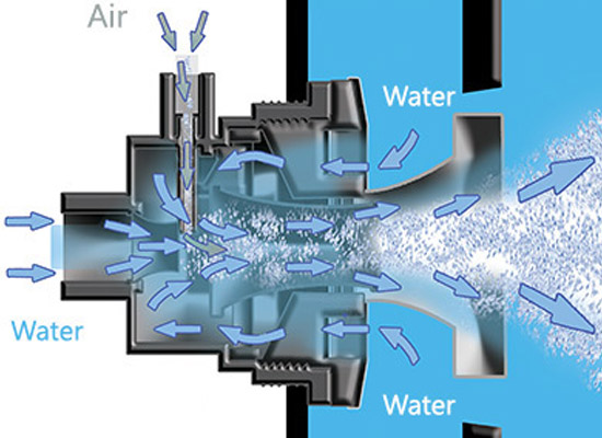 La velocidad del inyector y el agua de los yets ayudan a crear una presión negativa en todo el perímetro